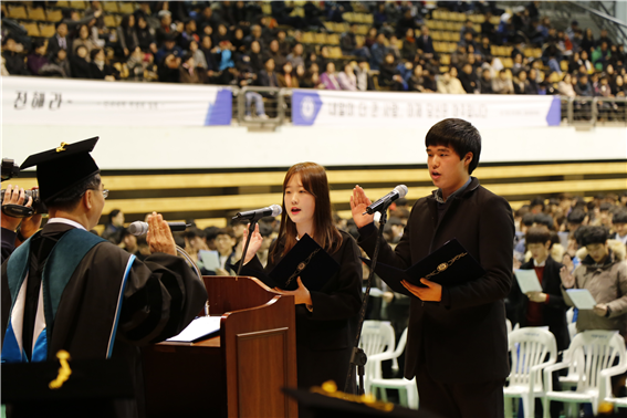 2016학년도 아주대학교 입학식이 23일 오전 10시 체육관에서 열렸다. 입학식은 임석철 교무처장의 학사보고로 시작해 ▲김동연 총장의 입학허가 선언 ▲신입생 대표 입학선서 ▲총장 입학식사 ▲주한 프랑스 대사 축사 순으로 이어졌다. 신입생 2056명을 대표해 문성진·이은경 학생이 입학선서에 나섰다. 신입생들은 ▲성실하게 학업에 정진하고 ▲용기 있게 도전하며 ▲타인과 약자를 배려하고 ▲더 나은 사회를 위해 기여하는 아주인이 되겠다고 다짐했다. 김동연 총장은 입학식사를 통해 “변화를 선도하는 대학 아주대학교의 구성원이 된 여러분에게 ‘도전과 배려’의 가치를 강조하고 싶다”며 “여러분이 대학 생활 동안 해야 할 가장 중요한 일 중 하나가 바로 ‘내가 하고 싶은 일’을 찾는 것”이라고 말했다. 김 총장은 “끊임없는 도전과 시행착오를 통해 자기만의 꿈을 찾아야 한다”며 “나와 함께 걸어가는 사람, 나 보다 약하고 어려운 사람들에 대한 사려 깊은 마음가짐이 몸에 밴 성숙한 어른이 되라”고 당부했다. 입학식에 함께 한 파비앙 페논(Fabien PENONE) 주한 프랑스 대사는 “치열한 경쟁을 뚫고 아주대학교에 입학한 여러분에게 축하 인사를 보낸다”며 “대학생활을 충분히 즐기라”고 조언했다. 한편 입학식 본 행사 이후에는 조영호 경영학과 교수의 아주 ‘유쾌한’ 토크쇼와 응원단 센토의 축하공연이 마련됐다.