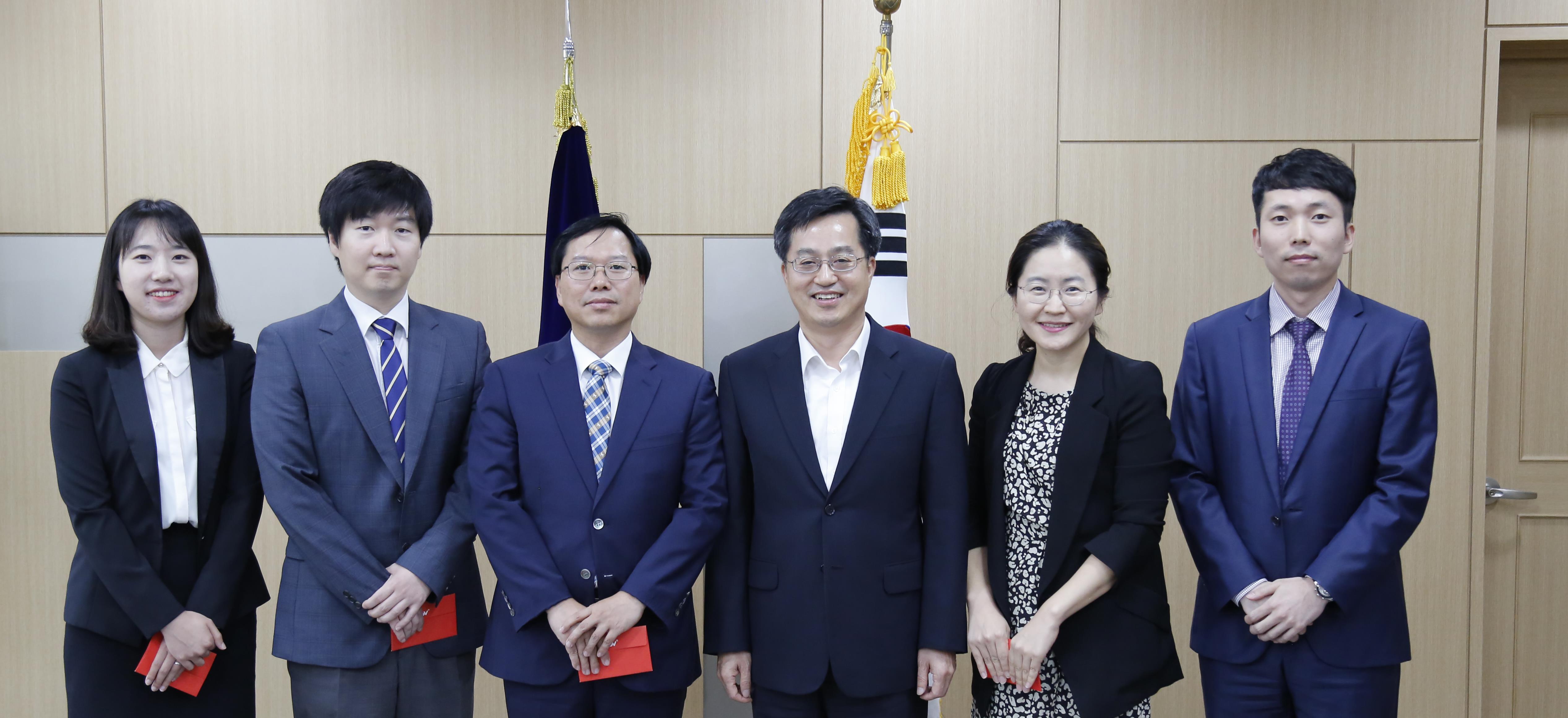 김동연 총장이 ‘9월의 부서’로 선정된 교원팀 직원들에게 소정의 상품을 전달하고 격려했다. 7일 오후 율곡관 총장실에서 김동연 총장은 교원팀 진성호 팀장, 장주아 과장, 정세훈 주임과 김성용, 박성희 씨에게 CGV 영화관람권을 전달했다. 이 자리에는 이주희 총무처장을 비롯한 처장단도 함께 했다. 교원팀은 지난 달 20~21일 열린 ‘2015 아주대 교수 워크숍’ 행사를 세심하게 준비하고 성공적으로 수행한 공을 인정받아 이달의 부서로 뽑혔다. 교수 워크숍은 아주대학교 발전전략 ‘Ajou Great Turning’ 발표와 토론 뿐 아니라 새로운 출발에 대한 단합을 모색하는 화합의 장이 됐다. 행사 당일 비가 내리는 등 여러 어려움이 있었지만 교원팀의 세심한 준비로 행사가 무사히 치러졌다. 직원들의 사기 진작과 동기 부여를 위해 시작된 ‘이달의 부서’ 시상은 지난 5월부터 진행됐다. 5월에는 교수학습개발센터가, 6월과 7월에는 LINC사업팀과 대학원 교학팀이 ‘이달의 부서’로 선정됐다.