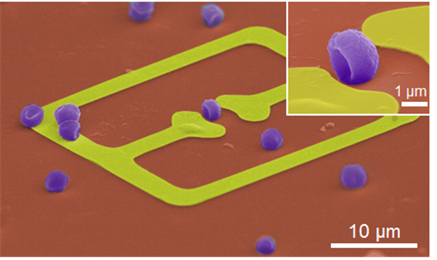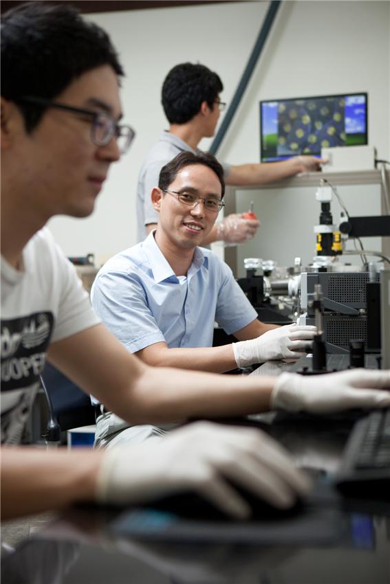 안영환(에너지시스템학과/물리학과) 교수팀이 테라헤르츠파에서 작동하는 메타물질을 이용해 곰팡이, 박테리아 등의 미생물을 빠르고 쉽게 검출해 낼 수 있는 센서 개발에 성공했다. 센서는 수초 이내에 곰팡이나 박테리아 같은 미생물들을 존재유무 뿐만 아니라 종류까지 감별해 낼 수 있다. 센서에 이용된 메타물질은 자연에서 존재하지 않는 전자기적, 광학적 성질을 갖도록 인공적인 구조체 배열을 통해 만들어진 물질로서 구조에 따라서는 투명망토, 음의 굴절률 등도 구현 가능해 많은 주목을 받고 있다. 연구결과는 한국과학재단의 중견연구자사업(핵심)을 통해 지원되었으며, “Detection of microorganisms using terahertz metamaterials”라는 제목으로 네이처 출판그룹의 사이언티픽 리포트(Scientific Reports)지 온라인판에 지난 5월 게재되었다. 곰팡이, 박테리아, 바이러스와 같은 유해 미생물들에 의한 질병이 급증하고 있는 가운데 미생물을 빠르고 정확하게 검출하는 기술에 대한 요구가 높아지고 있다. 하지만 미생물을 직접 검출할 수 있는 바이오센서 연구는 매우 미진한 상황이다. 현재로서 배양법이 가장 일반적인데 정확도면에서는 우수하지만 시간이 오래 걸리고, 실험실 환경이 갖춰져야 하며 상당한 숙련도가 필요하다는 단점이 있다. 안 교수팀은 테라헤르츠파에서 작동하는 메타물질이 구조적 특성상 마이크로미터(머리카락의 100분의 1) 크기의 물질에 민감하게 반응한다는 점에 착안해 센서를 만들었다. 물질의 크기가 너무 크거나 작으면 센서가 작동하지 않는데 미생물의 크기가 마이크로미터로 검출에 유리한 최적의 크기이기 때문이다. 테라헤르츠파에서 작용하는 메타물질 센서는 굴절률 변화를 통해 미생물의 유무는 물론 종류까지 판단해낼 수 있다. 기존의 배양법과 달리 극소량의 미생물만으로도 수초 이내에 검출이 가능해 시간, 환경, 숙련도 등의 제약을 받지 않는다. 논문에서 이미 곰팡이(페니실린, 효모, 흑국균 등), 박테리아(대장균, 유산균 등)와 같은 보편적인 미생물을 높은 감도로 측정해 검출 대상에 대한 제약도 거의 없다. 또한 센서를 항체(anti-body)로 조작하여 특정 미생물에만 선택적으로 반응하도록 해 유해 미생물만 검출하는데도 성공했다. 특히, 식품의 이물질 유무를 검사하기 위해 X-ray가 많이 쓰이고 있지만 방사능 피폭이나 검출물의 손상 때문에 테라헤르츠파가 주목을 받고 있으나 액체에 강하게 흡수되는 성질때문에 한계를 보여 왔다. 안 교수팀의 센서는 이러한 제약이 극복되어, 수중에 존재하는 다양한 박테리아 및 바이러스 검출에도 효율적이다. 안영환 교수는 “사물이 안보이도록 하는 메타물질이 오히려 미생물은 더 잘 보는 역설적인 결과이며 미생물을 검출하는 시도는 처음이다.”라고 말했다. 또 “지금은 테라헤르츠파 광원이 비싸 당장 보급은 어렵지만 후속 연구를 통해 실용화 시기도 곧 다가올 거라 생각한다.”고 말했다. 한편, 이번 연구는 에너지시스템학과 박사과정인 박세준 군이 제1저자로 실험과 이론계산을 수행했으며 생명과학과 김혜선 교수팀에서 곰팡이와 박테리아 시료를 제공했다. 관련기사 : 매일경제(2014.6.24), 매일경제(2014.6.26) 테라헤르츠파 메타물질 센서를 이용한 미생물 검출과정을 도식화 메타물질에 포획된 곰팡이(푸른곰팡이)의 전자현미경 사진