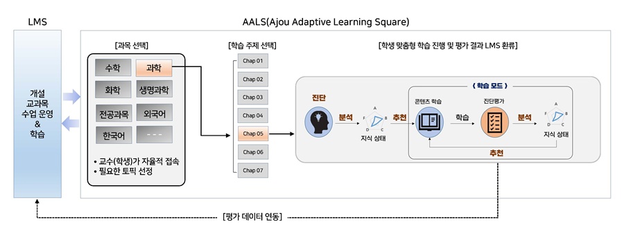 아주대는 학생 개인의 학습 수준 진단과 개별 학습 경로 추천 시스템을 2020년부터 선도적으로 적용해왔다. 그 동안의 노하우를 바탕으로 새롭게 추진하는 AALS가 AI 시대를 이끌어가는 대학 교육 시스템이 되도록 한다는 방침이다.