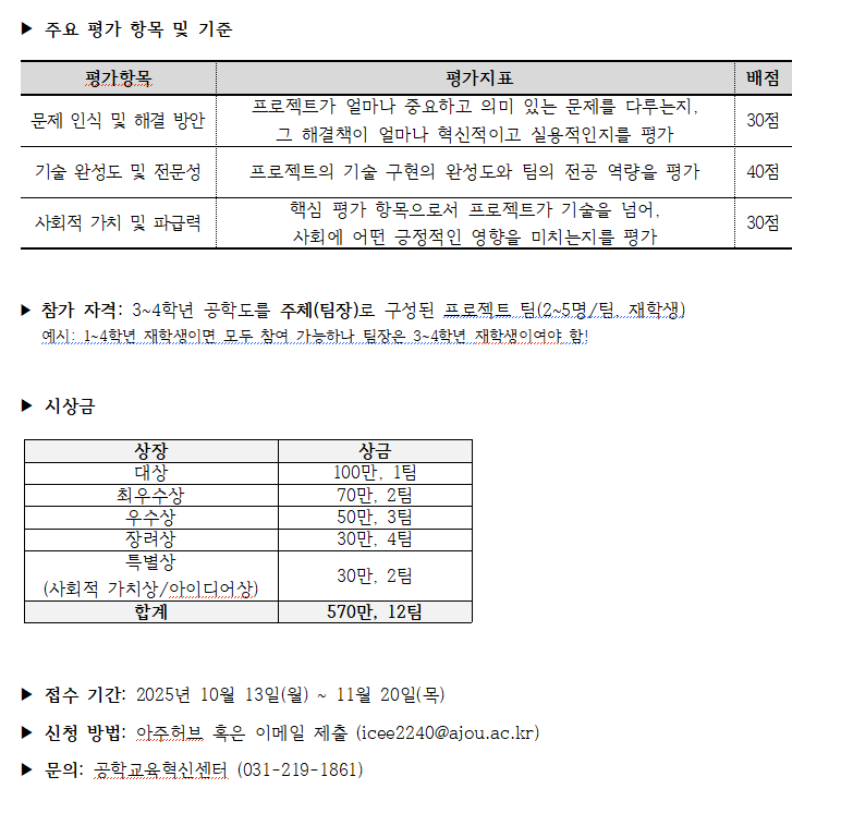 이번 대회를 통해 프로젝트의 가치를 인정받고,  미래 사회가 필요로 하는 공학 인재로 성장할 수 있는 기회를 잡으세요!!!