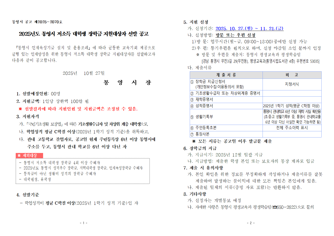 [장학] [교외장학] 2025년도 통영시 저소득 대학생 장학금 지원대상자 선발 공고