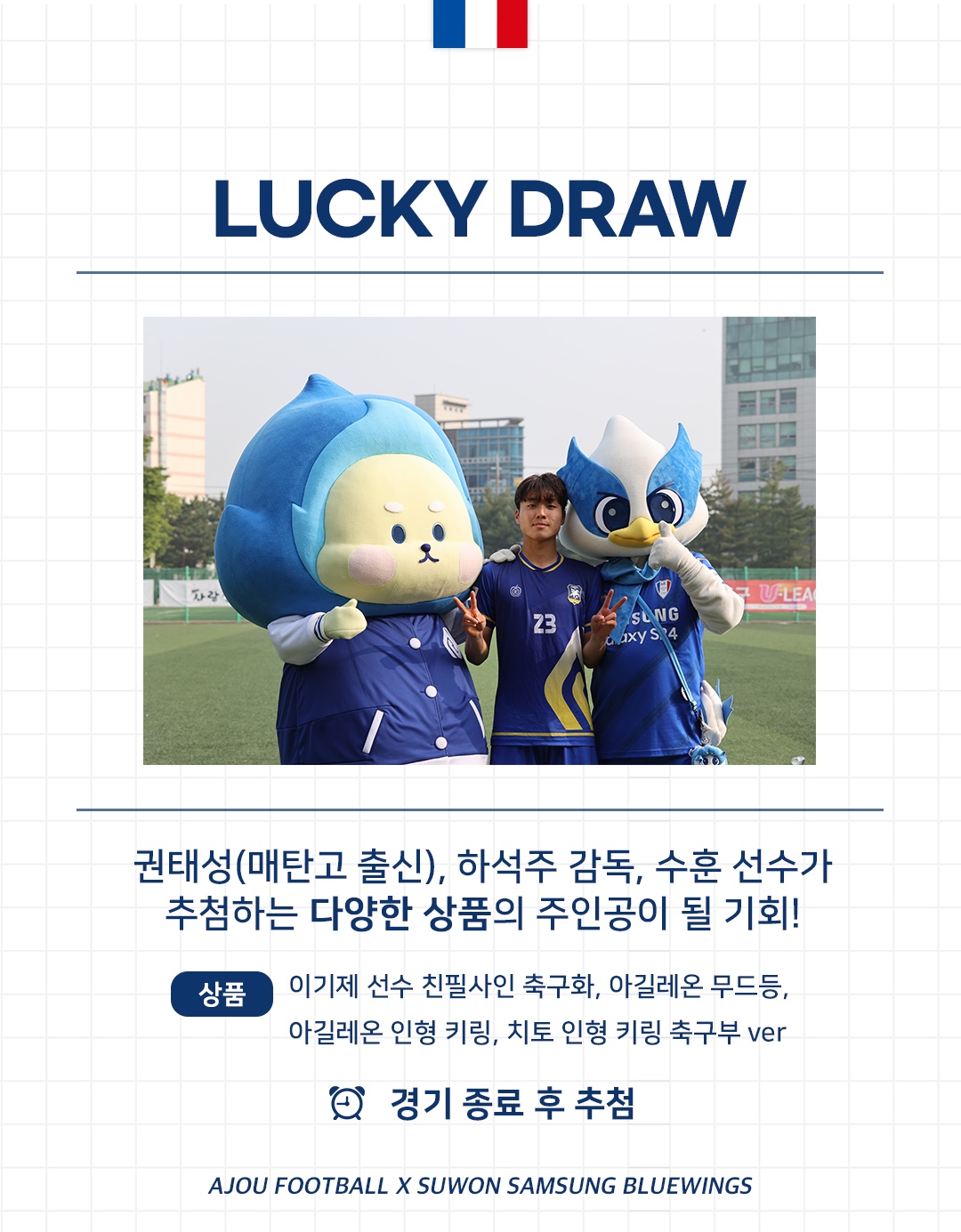 아주대학교 축구부와 수원삼성블루윙즈가 함께하는 특별한 이벤트부터 다양한 굿즈와 이기제 선수의 친필사인 축구화를 만날 수 있는 경품 추첨 이벤트까지🤫