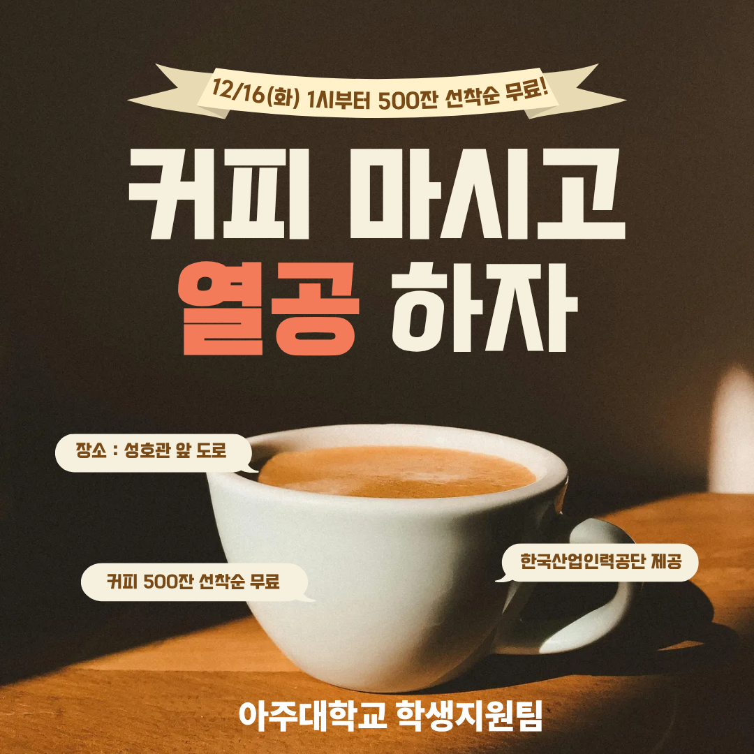 [행사] [학생지원팀]12월 16일(화), 아주대 학생들을 위한 커피차 이벤트 안내(한국산업인력공단)