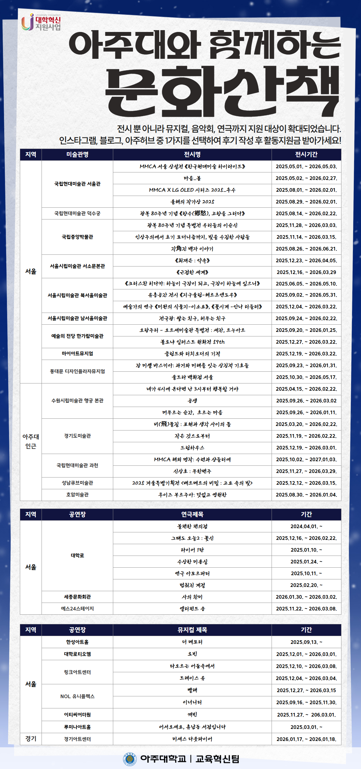 โป ์์ฃผํ๋ธ ์๋น์ค ์ข ๋ฃ๋ก ์ธํด ์ ์๊ฐ ๋ถ๊ฐ๋ฅํ ๊ฒฝ์ฐ ์ฐธ๊ฐ์ ์ฒญ์๋ฅผ ajouhub@ajou.ac.kr๋ก ๋ณด๋ด์ฃผ์๊ธธ ๋ฐ๋๋๋ค.