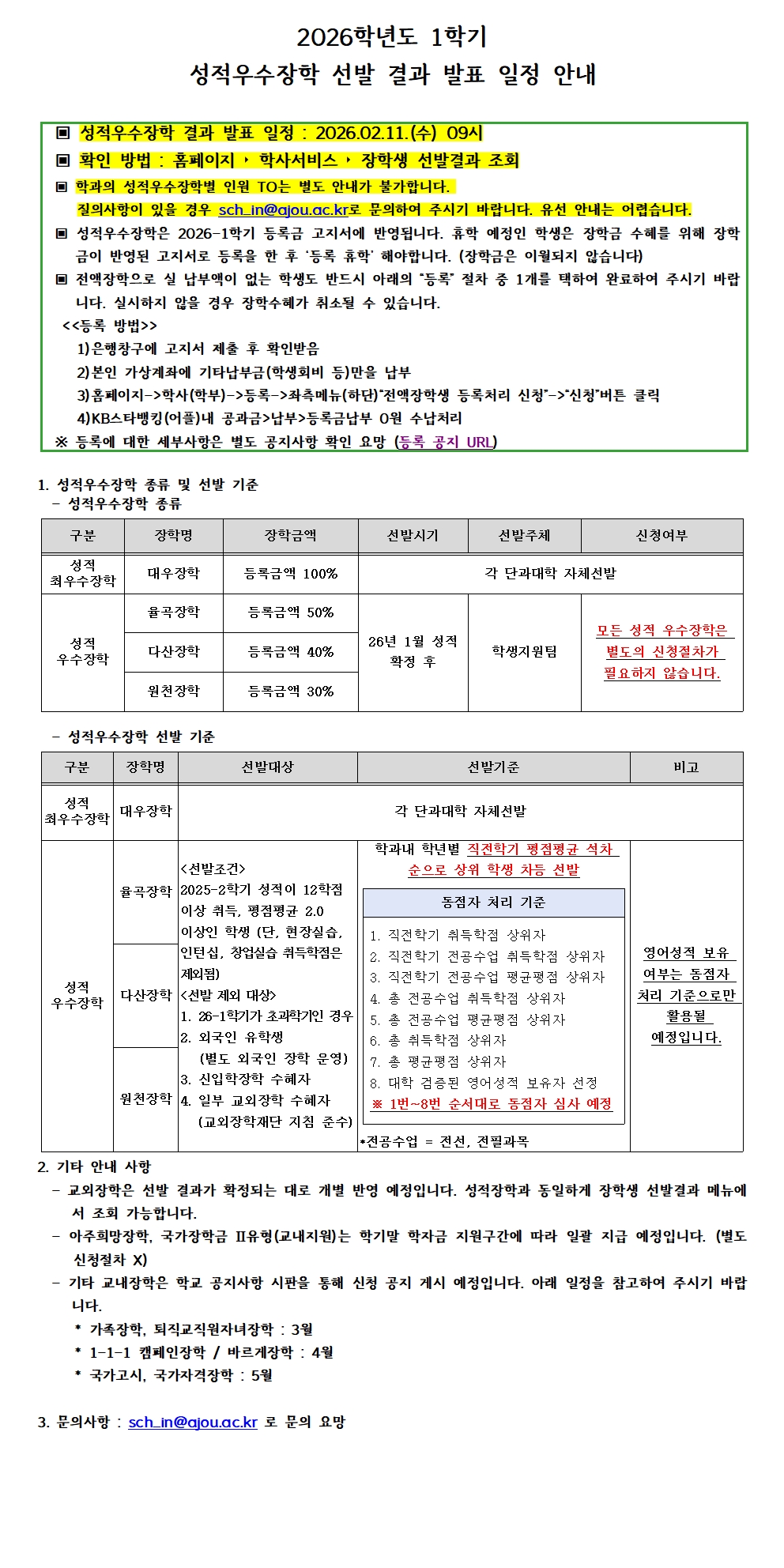 [장학] 2026학년도 1학기 성적우수장학 선발 결과 발표 일정 안내(2/11(수) 09시~)