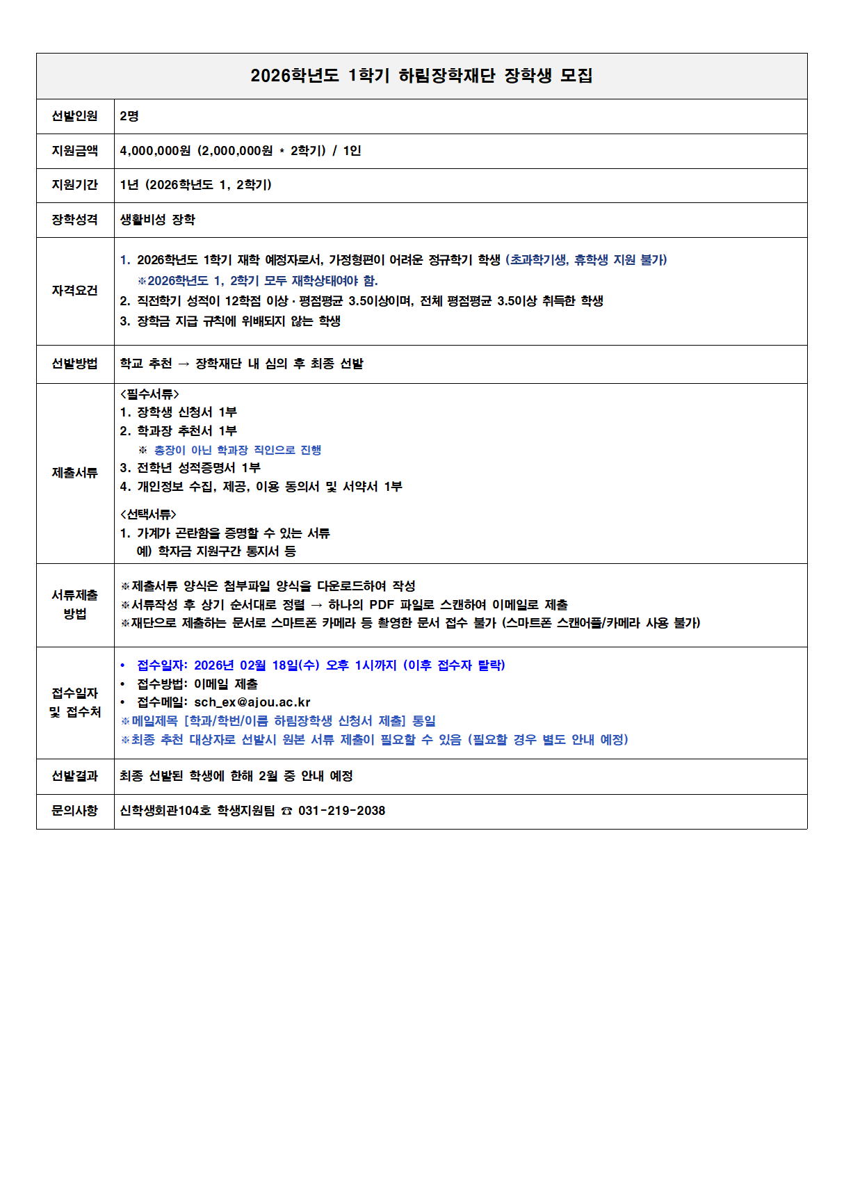 [장학] [교외장학] 2026학년도 하림장학재단 장학생 모집 공고 (~02.18.(수)까지)