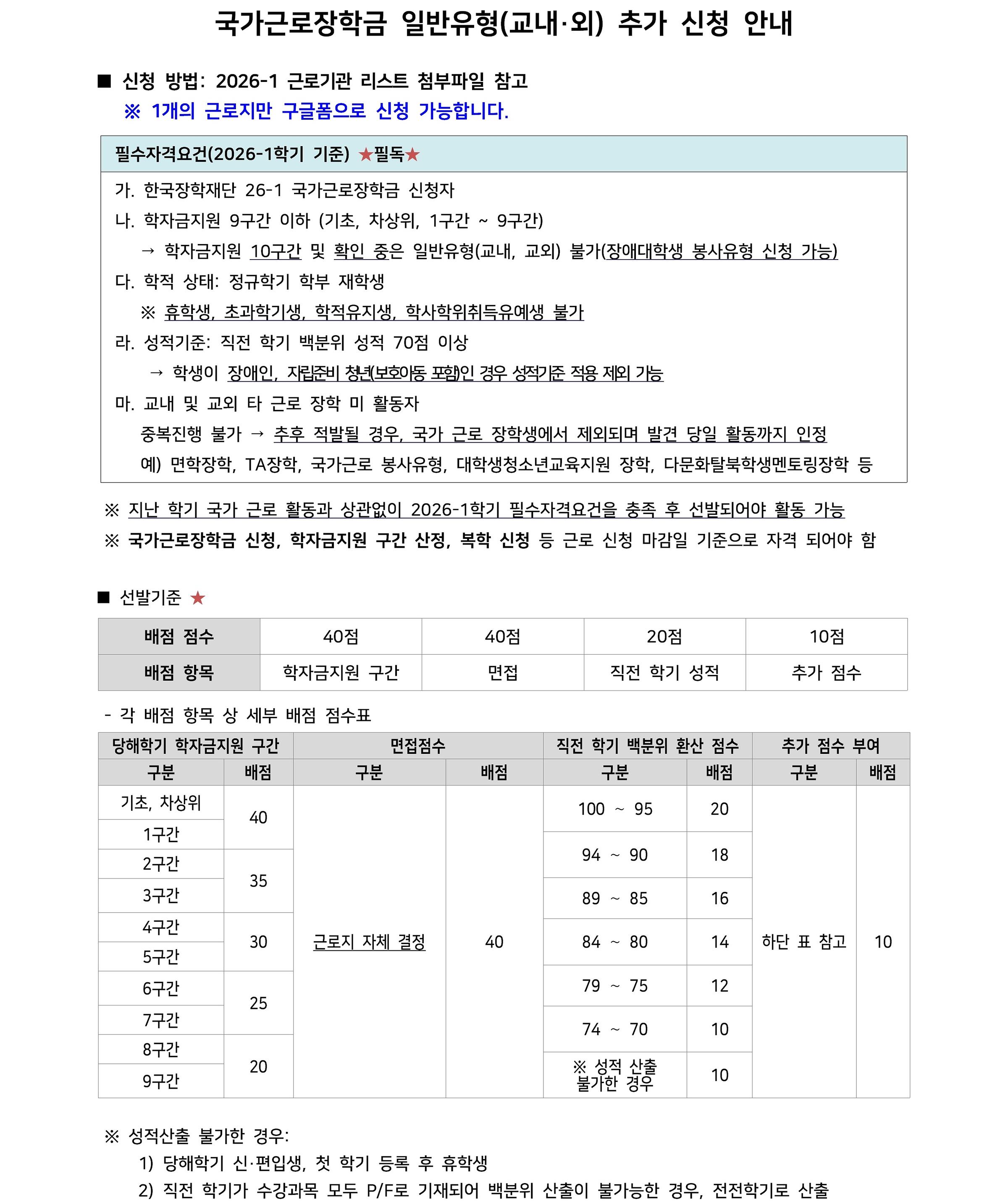 [장학] [국가근로] 2026-1 국가근로장학 일반유형(교내,교외) 2차 추가모집 신청 안내(기간연장)