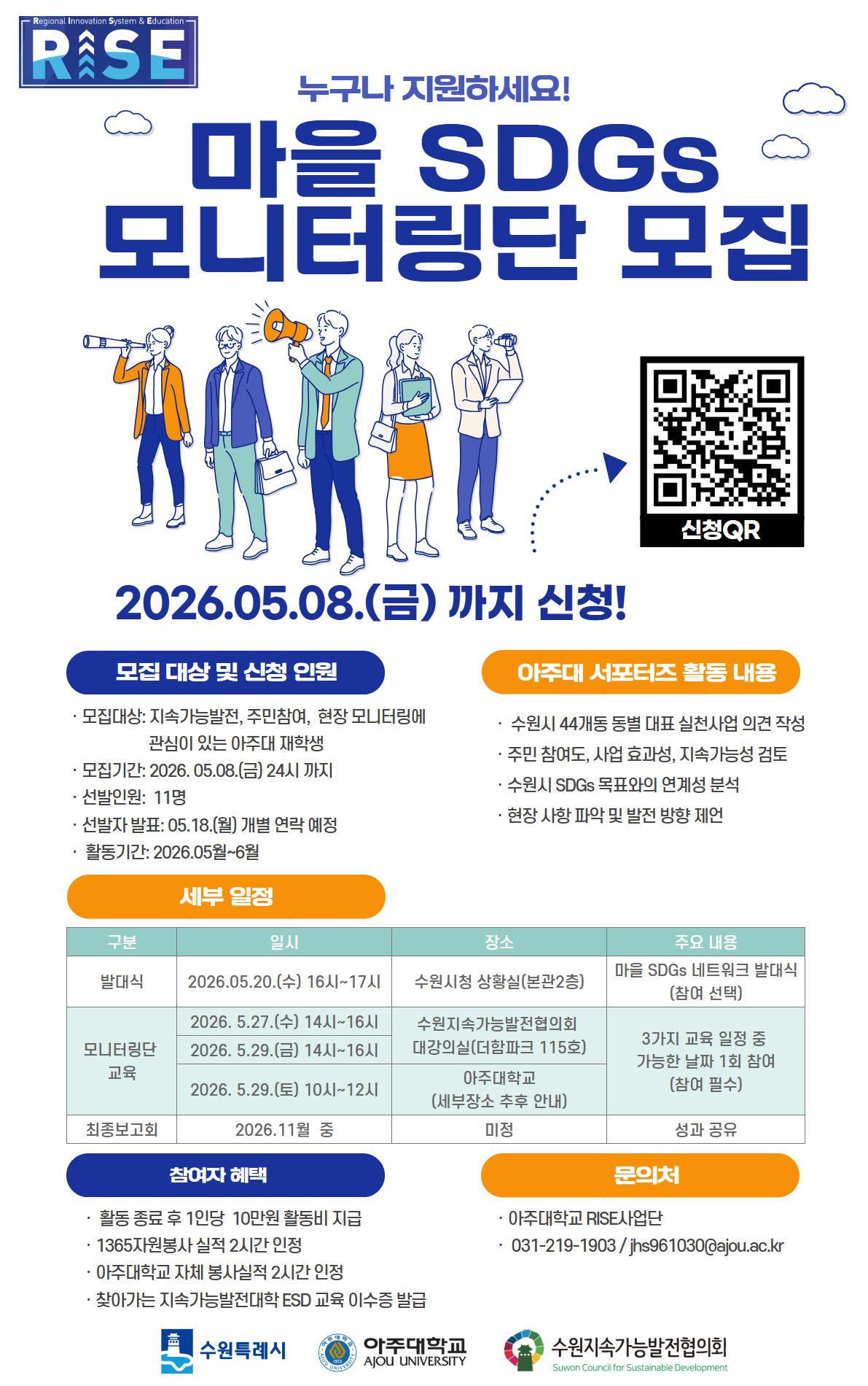 [비교과] [RISE] 2026 아주대학교와 함께하는 '수원시 마을 SDGs 모니터링단 역량강화 교육' 참여자 모집