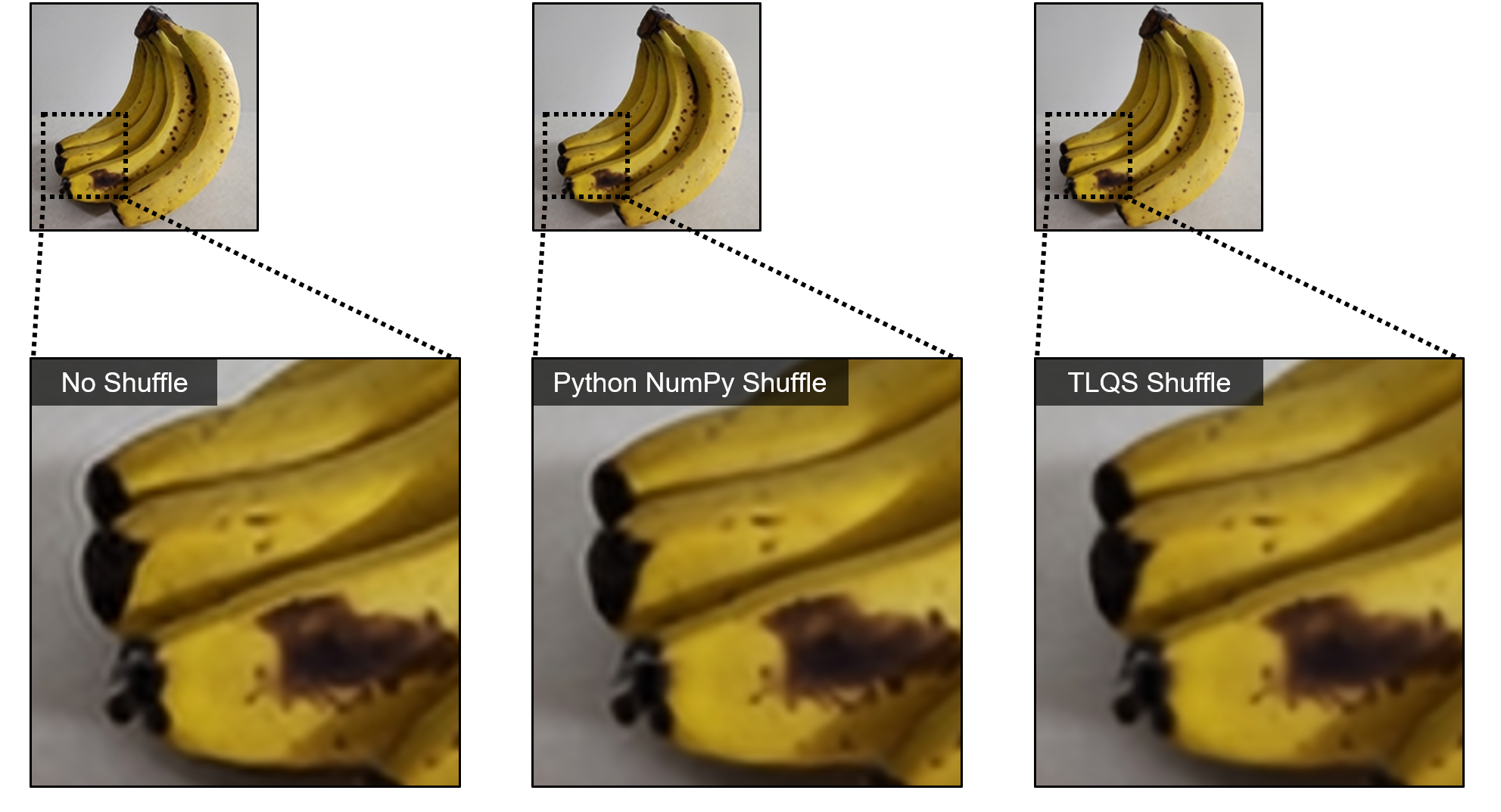 서로 다른 난수 데이터를 이미지 초해상도(VDSR) 신경망 학습 기술에 적용해 이미지 해상도를 높인 결과를 보여주는 이미지. 제일 왼쪽이 난수를 사용하지 않은 결과, 가운데는 기존 파이썬 기반 NumPy 의사난수를 이용한 결과, 오른쪽이 TLQS 기반 난수를 이용한 결과를 보여준다. 이미지를 확대해 보면, 첫 번째 이미지와 다른 두 이미지는 제일 왼쪽 볼록한 경계 부분과 오른쪽 아래 갈색 얼룩 부분에서 해상도 차이를 보인다. 이번 연구를 통해 개발한 TLQS 난수를 이용하면 기존 NumPy 난수를 이용한 것과 유사하거나 더 우수한 성능을 보임을 확인했다
