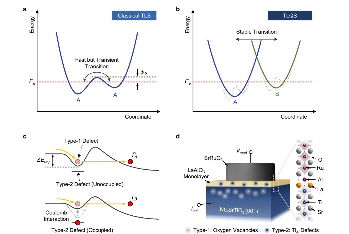 TiAl 결함에 전자가 일시적으로 포획되면 주변 산소 공공(VO)의 에너지 준위가 순간적으로 변하며, 이는 결과적으로 이산적인 터널링 전류의 변동을 유도한다. 이러한 구조는 실온에서도 169초 이상 안정적으로 유지되는 이산 전류 요동을 보였고, 1년 이상 안정적으로 동작했다.