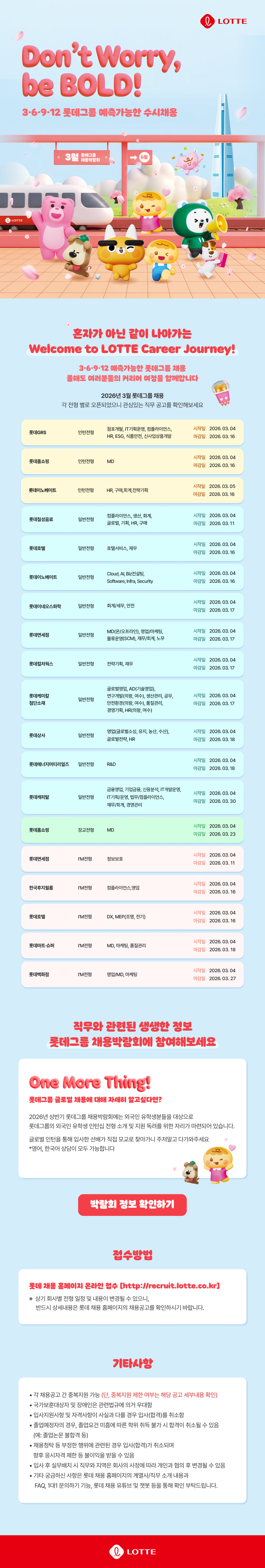 ■ 2026년 3월 롯데그룹 채용박람회- 일시 : 2026년 3월 3일(화) ~ 3월 9일(월)- 진행 학교 : 서울대, 고려대, 한양대, 연세대, 서강대, 성균관대(자연), 이화여대