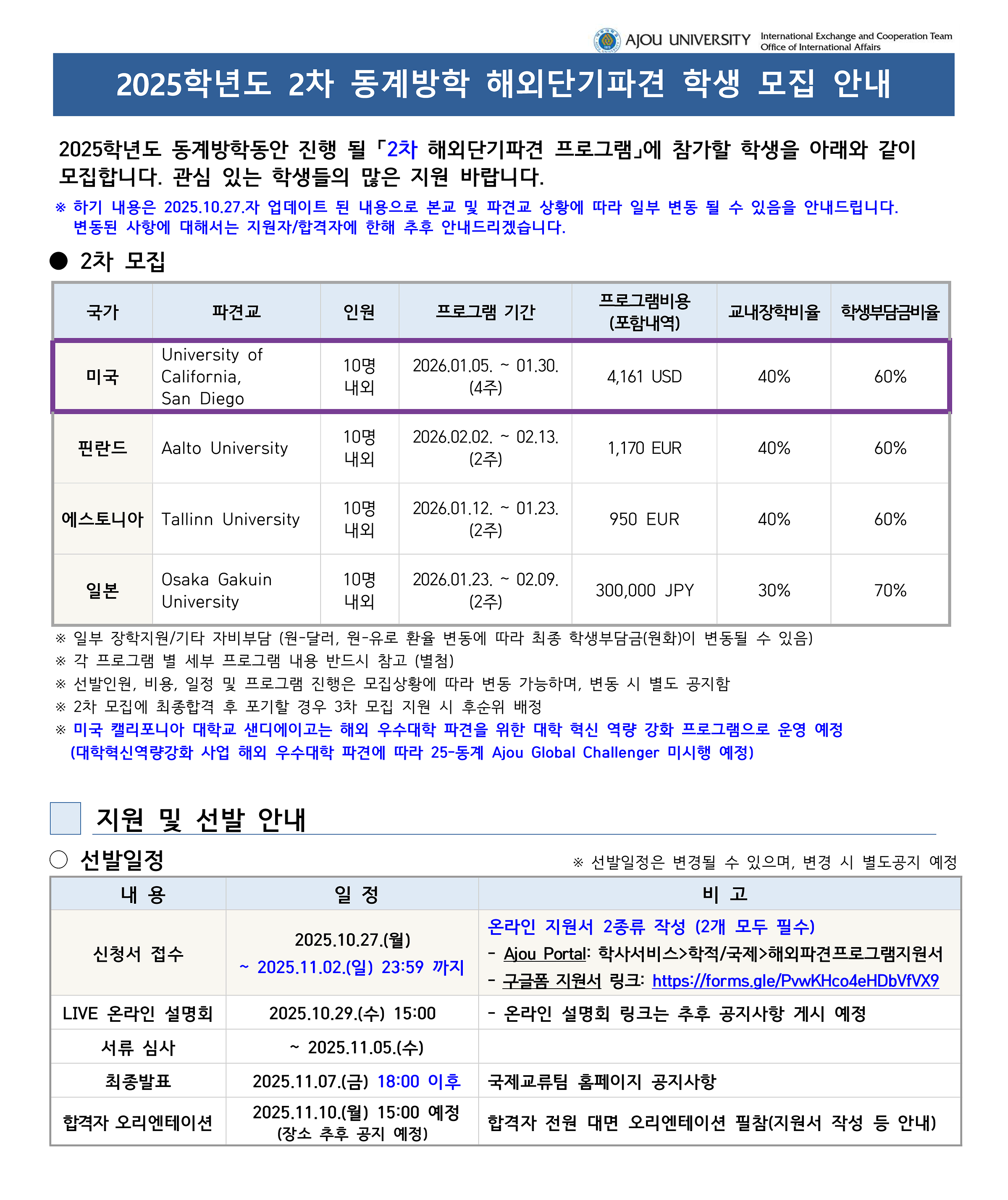 [Outgoing] [국제교류팀] [동계 2차] 2025 해외단기파견 프로그램 참가자 모집 (10/27~11/2)